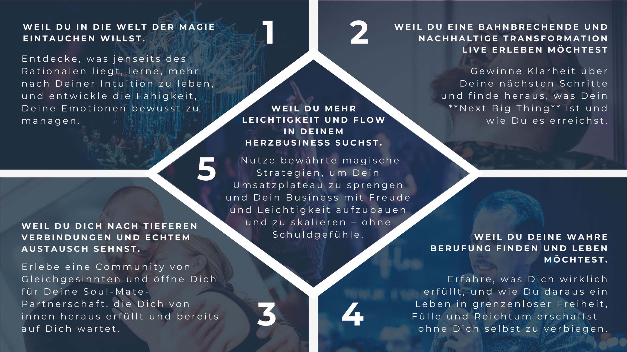 Mit etwas Glück sitzt du auf dem Hot-Seat und lässt Deine größte Blockade live und direkt mit der eigens entwickelten Magie-Chance-Methode sprengen. Doch auch als Zuschauer erlebst Du hautnah, wie sich Deine Muster und Programme auflösen und sich pure Leichtigkeit verwandeln