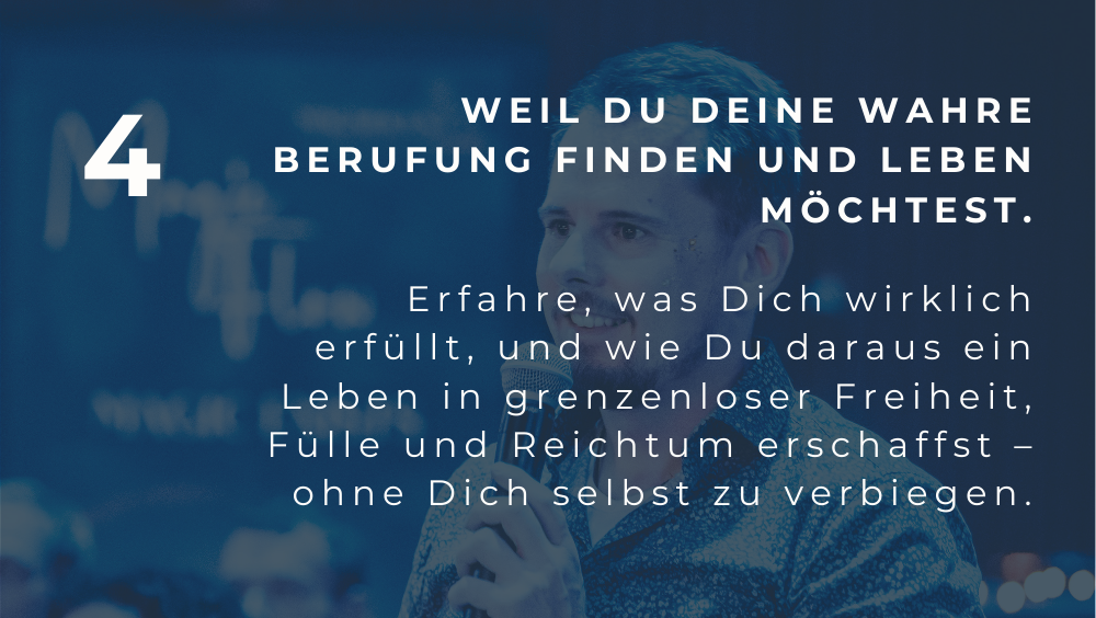Du erlebst nicht nur eine Show, sondern eine echte Transformation. Du lernst, wie du Blockaden und festgefahrene Muster auflöst, deine innere Essenz entfesselst und ein Leben voller Leichtigkeit, Freude und Erfüllung erschaffst. Du erhältst zudem die magische Technik als Blueprint, mit der Jonas tiefgreifende Veränderungen bewirkt.